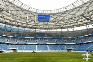 梭鱼湾足球场正加紧草坪养护等工作,球员通道地毯换成蓝色